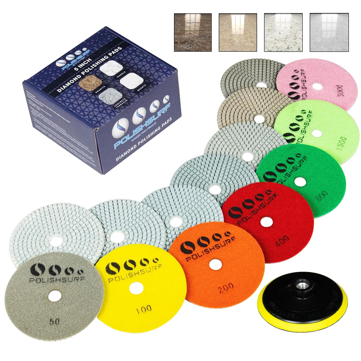 They attach to angle grinders or polishers and come in different grit levels (e.g., 50 to 3000 grit).